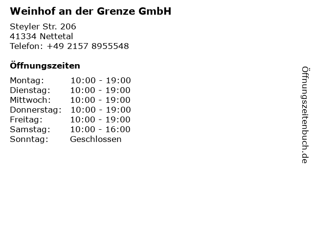 | Öffnungszeiten Weinhof an der Grenze GmbH in Nettetal anzeigen | |