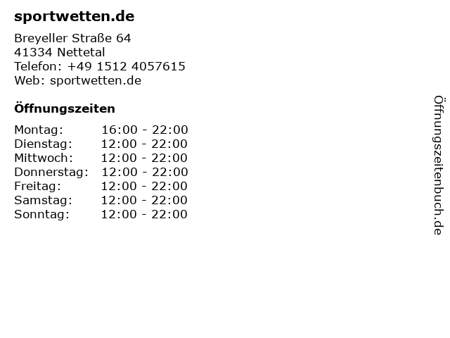 | Öffnungszeiten sportwetten.de in Nettetal anzeigen | |