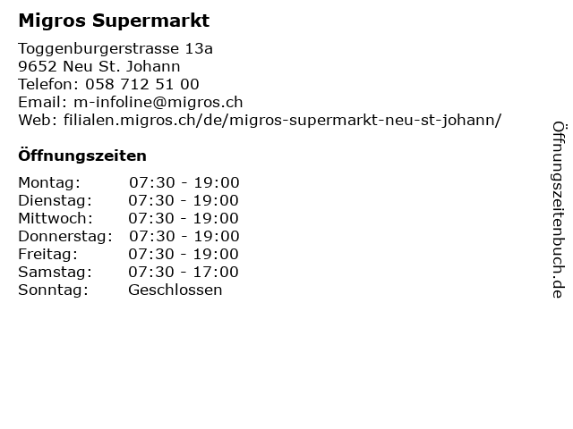 | Öffnungszeiten Migros Supermarkt in Neu St. Johann anzeigen | |