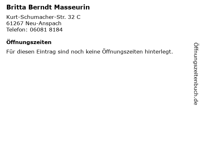 | Öffnungszeiten Britta Berndt Masseurin in Neu-Anspach anzeigen | |