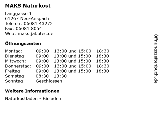 | Öffnungszeiten MAKS Naturkost in Neu-Anspach anzeigen | |
