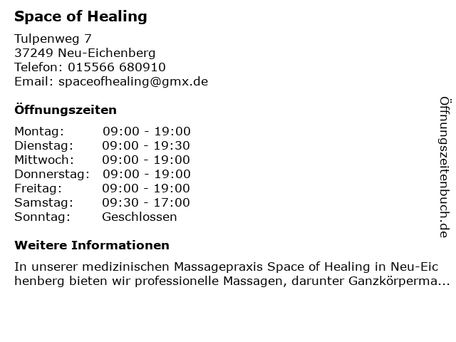 | Öffnungszeiten Space of Healing in Neu-Eichenberg anzeigen | |