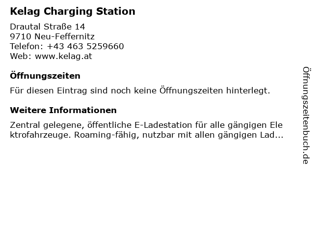 Branchen & Suchbegriffe zu Kelag Charging Station:charging, direktzahlung, e-auto, kelag, offen 24h, roaming, schnellladestation, station, öffentlich |