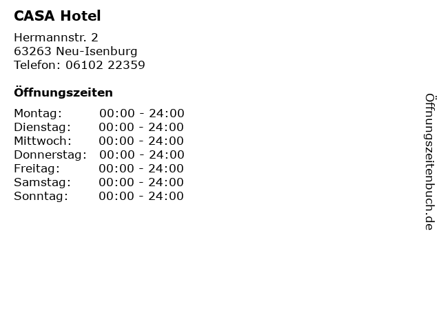 | Öffnungszeiten CASA Hotel in Neu-Isenburg anzeigen | |