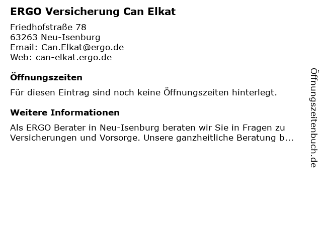 | Öffnungszeiten ERGO Versicherung Can Elkat in Neu-Isenburg anzeigen | |