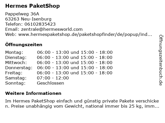 | Öffnungszeiten Hermes PaketShop in Neu-Isenburg anzeigen | |