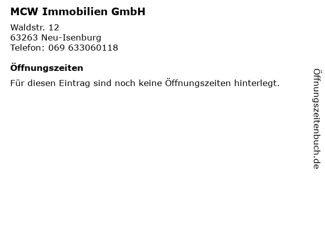 | Öffnungszeiten MCW Immobilien GmbH in Neu-Isenburg anzeigen | |