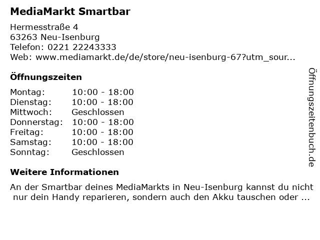 | Öffnungszeiten MediaMarkt Smartbar in Neu-Isenburg anzeigen | |