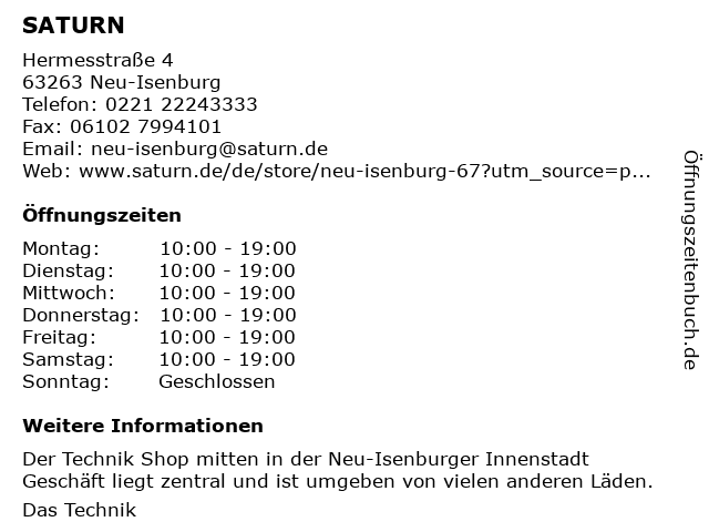 Öffnungszeiten SATURN in Neu-Isenburg anzeigen | |