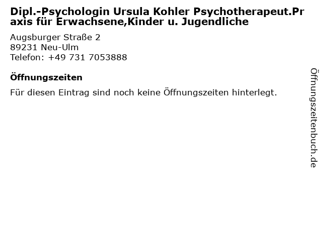 | Dipl.-Psychologin Ursula Kohler Psychotherapeut.Praxis für Erwachsene,Kinder u. Jugendliche anrufen | |