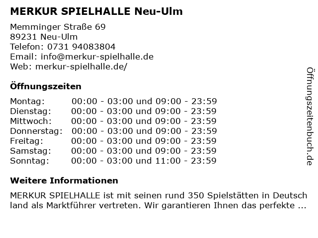 | Öffnungszeiten MERKUR SPIELHALLE Neu-Ulm in Neu-Ulm anzeigen | |