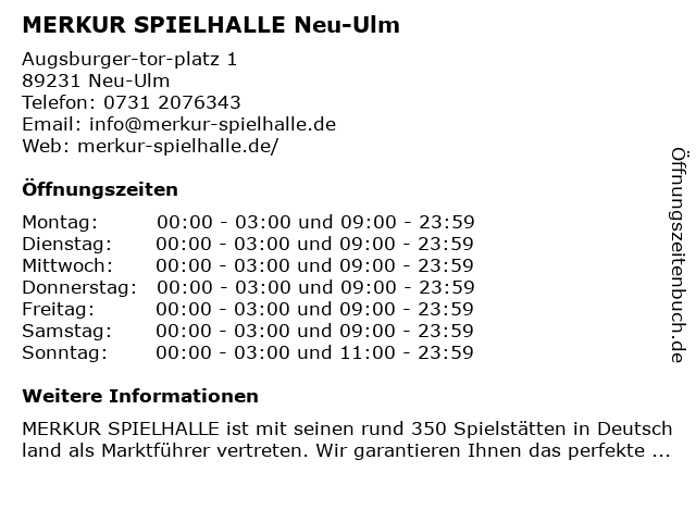 | Öffnungszeiten MERKUR SPIELHALLE Neu-Ulm in Neu-Ulm anzeigen | |