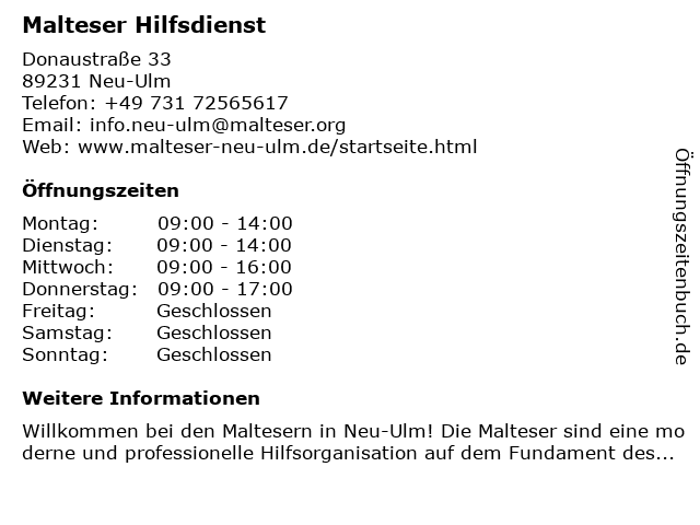 | Öffnungszeiten Malteser Hilfsdienst in Neu-Ulm anzeigen | |