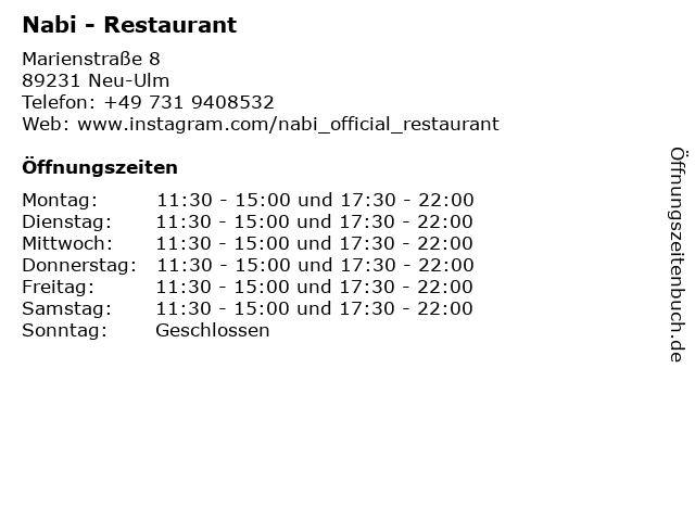 | Öffnungszeiten Nabi - Restaurant in Neu-Ulm anzeigen | |