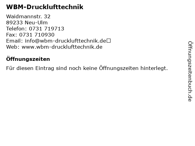 | Öffnungszeiten WBM-Drucklufttechnik in Neu-Ulm anzeigen | |