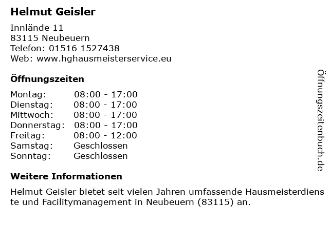 | Öffnungszeiten Helmut Geisler in Neubeuern anzeigen | |