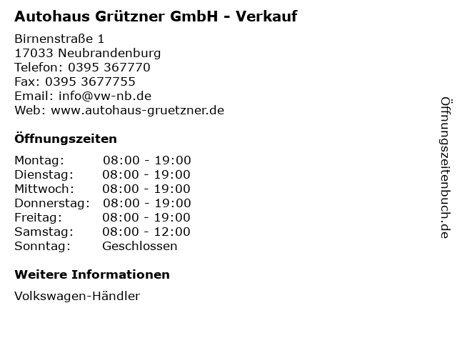 2 Autohaus Grützner GmbH - Werkstatt & Service (Entfernung: 0,00 km) Birnenstr. 1, 17033 Neubrandenburg 6 |