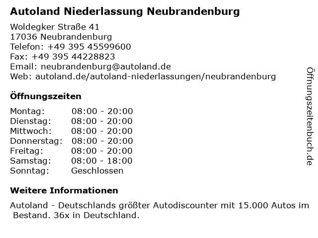 1 Autoland AG Niederlassung Neubrandenburg - Werkstatt (Entfernung: 0,01 km) Woldegker Straße 41, 17036 Neubrandenburg 2 ALBA Metall Nord GmbH - Niederlassung Vorpommern - Betriebsstätte Neubrandenburg (Entfernung: 0,86 km) Kruseshoferstraße 21, 17036 Neubrandenburg 3 Eisen- und Kunststoffhandel Minden GmbH Niederlassung Neubrandenburg (Entfernung: 1,29 km) Gneisstr. 9, 17036 Neubrandenburg 4 11880 Internet Services AG, Vertriebs-Niederlassung Neubrandenburg (Entfernung: 2,92 km) Friedrich-Engels-Ring 52, 17033 Neubrandenburg 5 11880 Solutions AG, Niederlassung Neubrandenburg (Entfernung: 2,92 km) Friedrich-Engels-Ring 52, 17033 Neubrandenburg 6 |