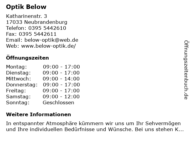 | Öffnungszeiten Optik Below in Neubrandenburg anzeigen | |