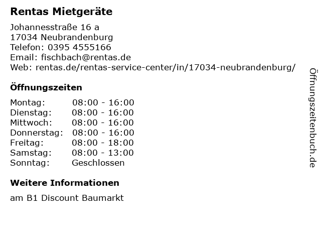 | Öffnungszeiten Rentas Mietgeräte in Neubrandenburg anzeigen | |