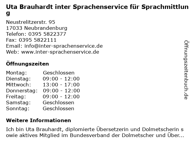 3 inter Sprachenservice Uta Brauhardt Übersetzungs- und Dolmetscherdienst (Entfernung: 2,21 km) Helmut-Just-Str. 4, 17036 Neubrandenburg 6 |