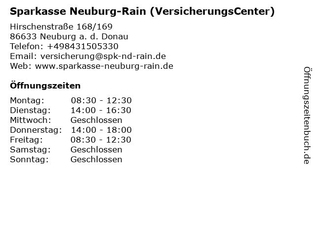 1 Sparkasse Altbayern (Geldautomat) (Entfernung: 0,00 km) Hirschenstraße 168/169, 86633 Neuburg an der Donau 2 Sparkasse Neuburg-Rain - VersicherungsCenter VC Neuburg (Entfernung: 0,00 km) Hirschenstraße 168/169, 86633 Neuburg 6 |