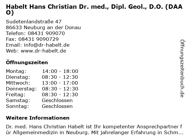 Branchen & Suchbegriffe zu Habelt Hans Christian Dr. med., Dipl. Geol., D.O. (DAAO):christian, d.o., daao, dipl., dr., geol., habelt, hans, med. |