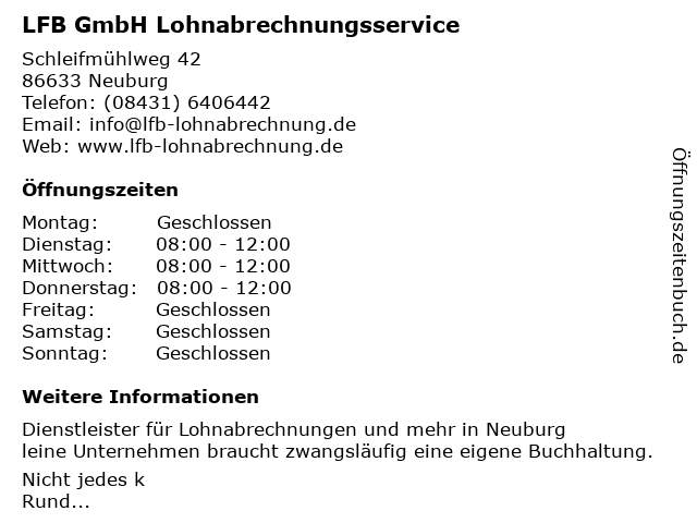 Branchen & Suchbegriffe zu LFB GmbH Lohnabrechnungsservice:abrechnung, baulohnabrechnung, baulöhne, gehaltsabrechnungen, laufende baulohnabrechnung, lfb, lohnabrechnungen, lohnabrechnungsservice, personalabrechnung |