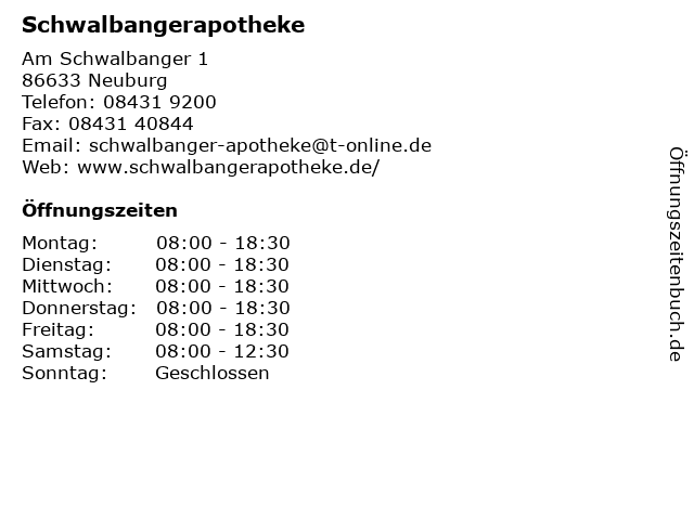 | Öffnungszeiten Schwalbangerapotheke in Neuburg anzeigen | |