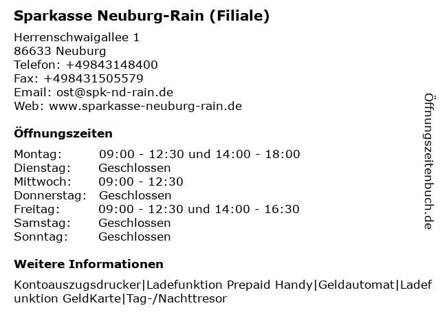 | Öffnungszeiten Sparkasse Altbayern (Filiale) in Neuburg anzeigen | |