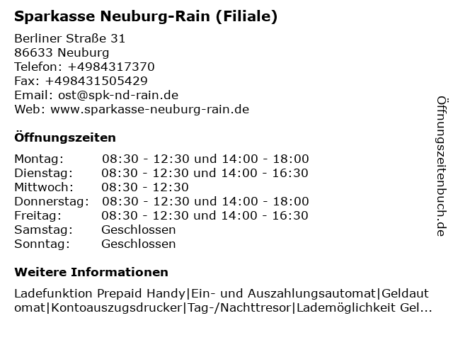 | Öffnungszeiten Sparkasse Altbayern (Filiale) in Neuburg anzeigen | |
