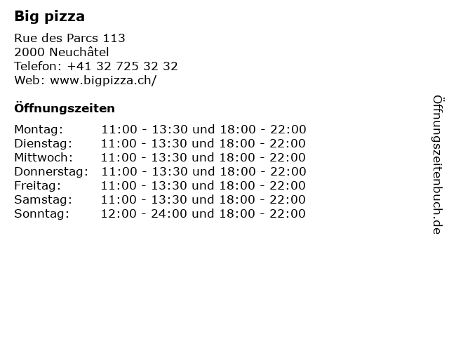 | Öffnungszeiten Big pizza in Neuchâtel anzeigen | |