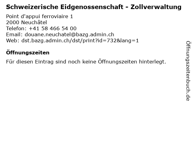 1 Schweizerische Eidgenossenschaft - Zollverwaltung (Entfernung: 14,42 km) Crêt-du-Locle 10, 2304 La Chaux-de-Fonds 2 5 Die Schweizerische Post AG - Geschäftskundenschalter (Entfernung: 0,96 km) Place Numa-Droz 2, 2000 Neuchatel 6 |
