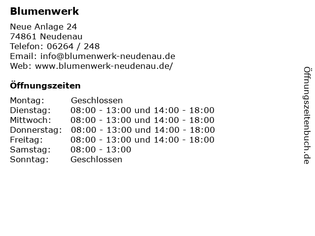 | Öffnungszeiten Blumenwerk in Neudenau anzeigen | |