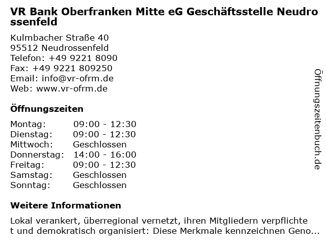 1 VR-Bank Bayreuth - Geschäftsstelle Neudrossenfeld (Entfernung: 0,84 km) Kulmbacher Str. 2, 95512 Neudrossenfeld 2 VR Bank Oberfranken Mitte eG Geschäftsstelle Neuenreuth (Entfernung: 2,45 km) Unterobsang 26, 95512 Neudrossenfeld 3 VR-Bank Bayreuth (Geldautomat Heinersreuth) (Entfernung: 6,11 km) Fehringer Platz 1, 95500 Heinersreuth 4 VR Bank Oberfranken Mitte eG Geschäftsstelle Thurnau (Entfernung: 7,70 km) Bahnhofstraße 14, 95349 Thurnau 6 |