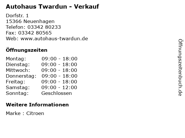| Öffnungszeiten Autohaus Twardun - Verkauf in Neuenhagen anzeigen | |