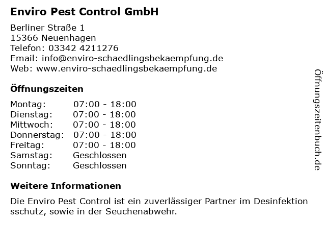 | Öffnungszeiten Enviro Pest Control GmbH in Neuenhagen anzeigen | |