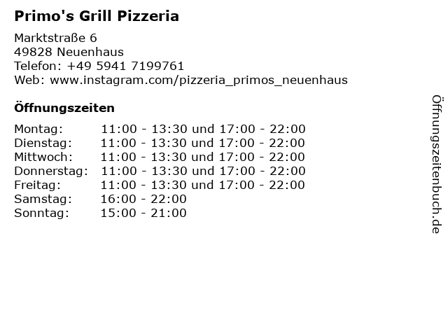 | Öffnungszeiten Primo's Grill Pizzeria in Neuenhaus anzeigen | |