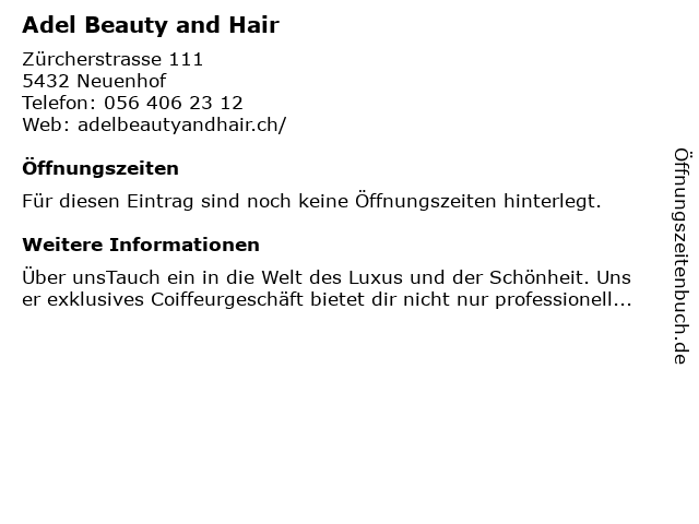 | Telefonnummer Adel Beauty and Hair in Neuenhof (056 406 23 12) anrufen | |