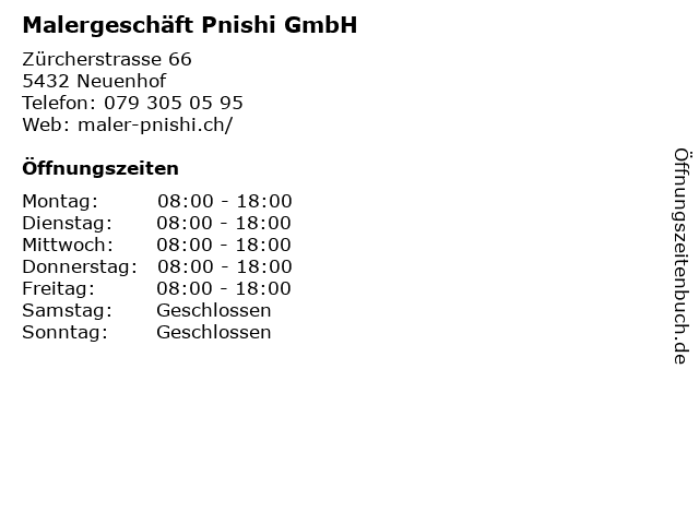 | Öffnungszeiten Malergeschäft Pnishi GmbH in Neuenhof anzeigen | |