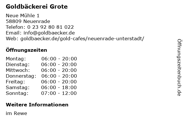 | Öffnungszeiten Goldbäckerei Grote in Neuenrade anzeigen | |
