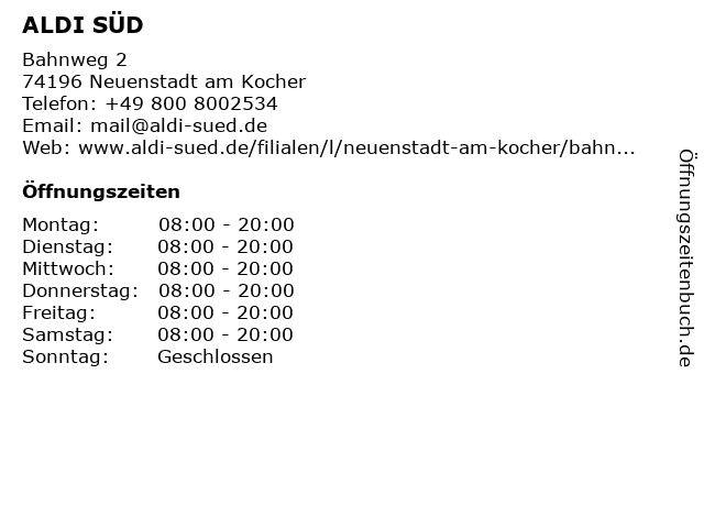 | Adresse ALDI SÜD in Neuenstadt am Kocher anzeigen |
