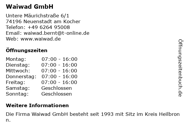 | Adresse Waiwad GmbH in Neuenstadt am Kocher anzeigen |