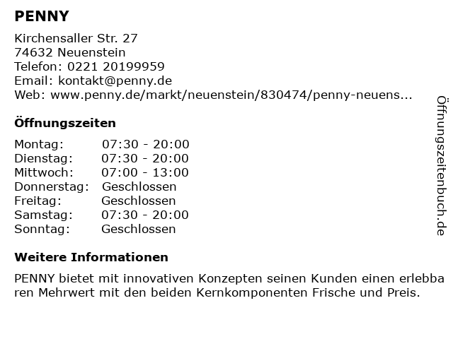 | Öffnungszeiten PENNY in Neuenstein anzeigen | |