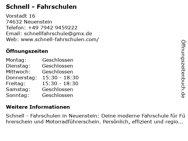 | Öffnungszeiten Schnell - Fahrschulen in Neuenstein anzeigen | |