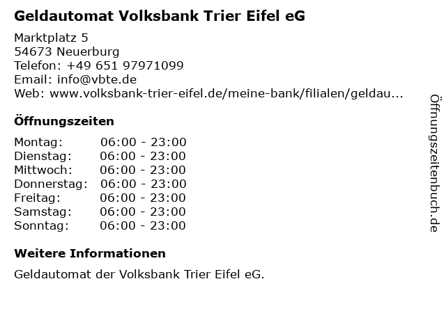 Branchen & Suchbegriffe zu Geldautomat Volksbank Trier Eifel eG:bargeld abheben, bargeld einzahlen, eg, eifel, geldautomat, volksbank |