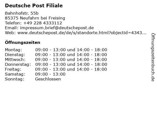 Deutsche Post Filiale in Neufahrn bei Freising: Telefonnummer, Öffnungszeiten und Adresse