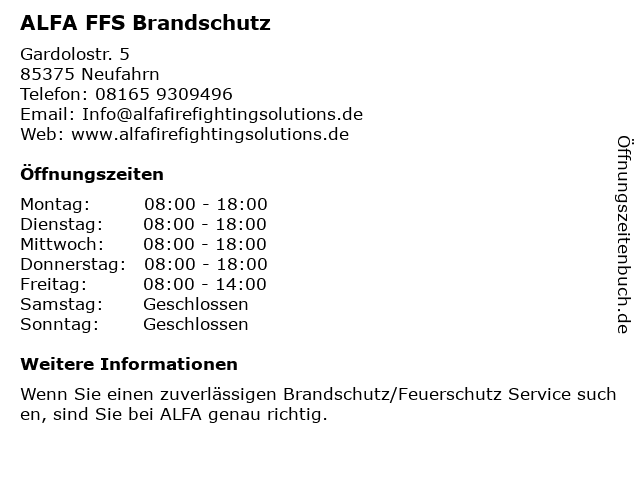 | Öffnungszeiten ALFA FFS Brandschutz in Neufahrn anzeigen | |
