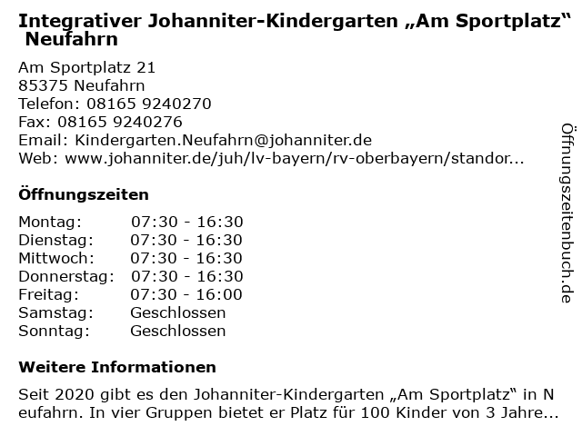 Branchen & Suchbegriffe zu Integrativer Johanniter-Kindergarten „Am Sportplatz“ Neufahrn:agentur für kinderbetreuung, gemeinnützige organisation, hilfsorganisation, integrativer, johanniter, kindergarten, sozialarbeit, sportplatz“, verband, wohlfahrtseinrichtung, „am |