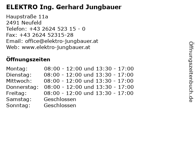 1 Elektro Jungbauer Inhaber Robert Hubner e. U. (Entfernung: 17,65 km) Jägerzeile 9, 2721 Bad Fischau-Brunn 6 |